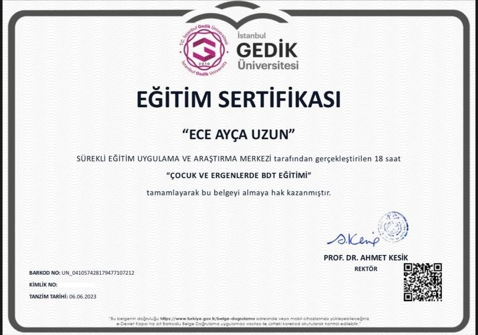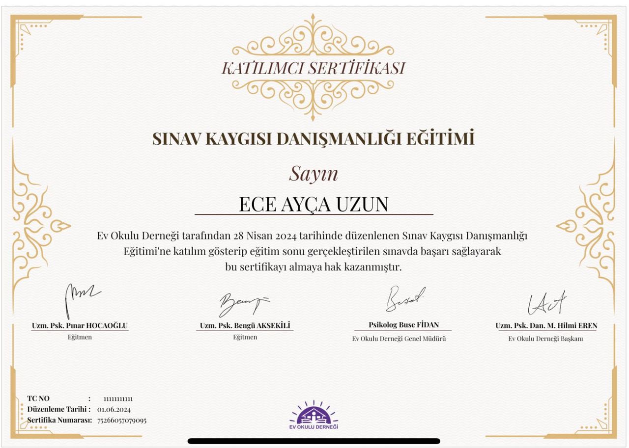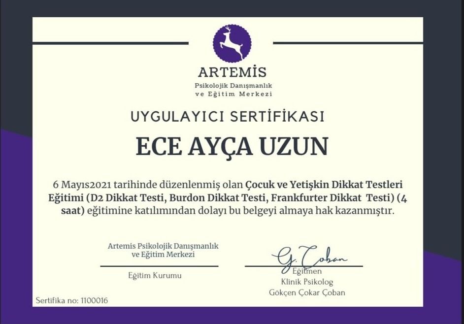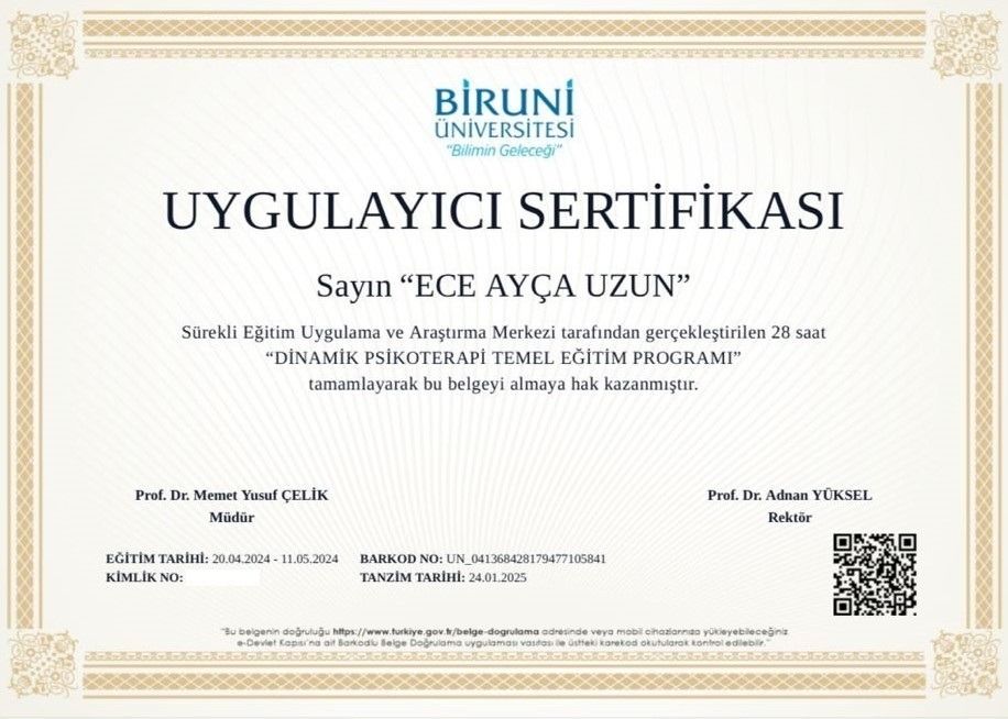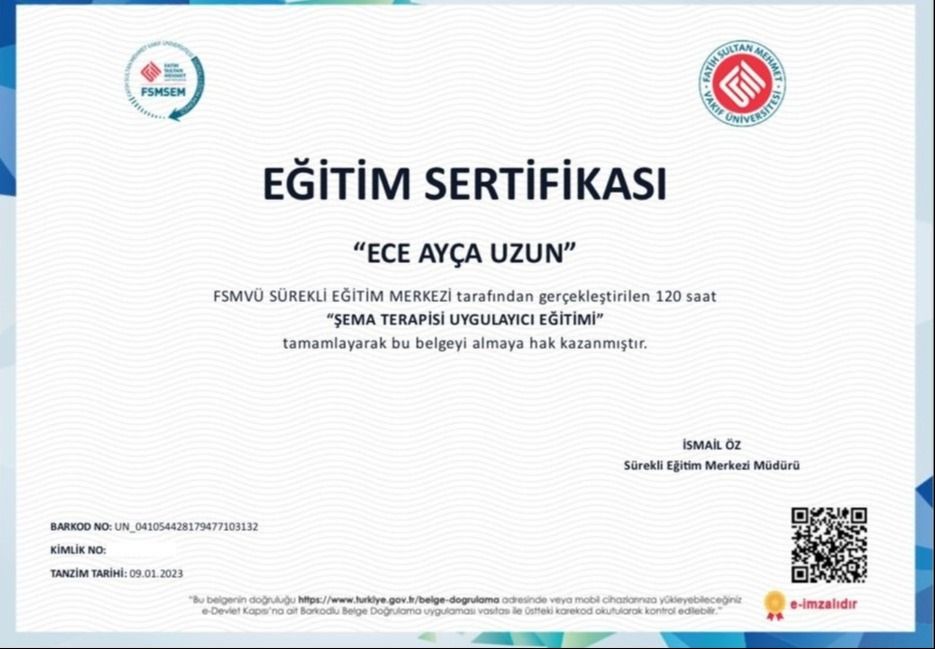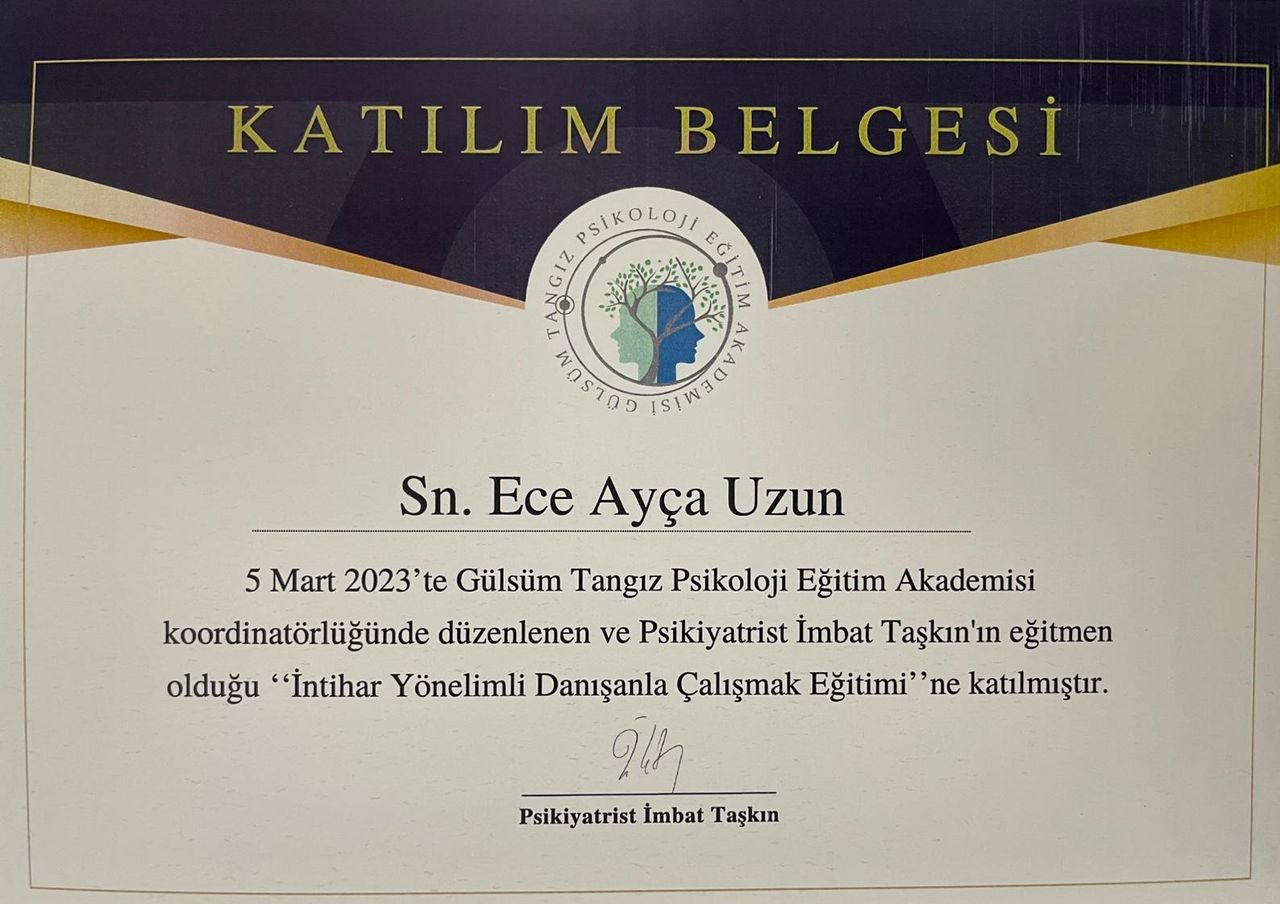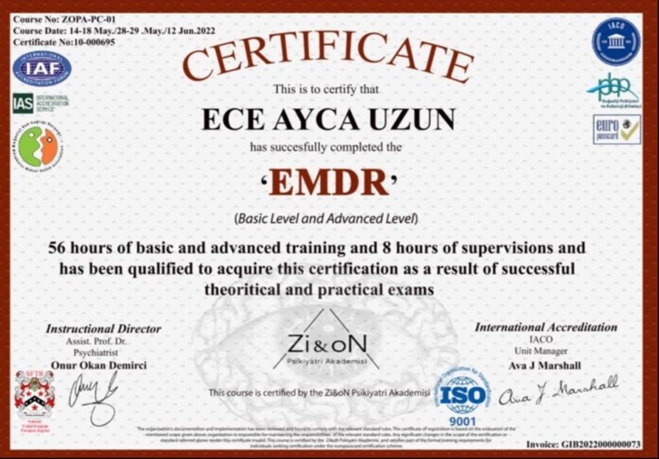"Psikofarmakoloji" ve "Kilnik Nörobilim" alanlarındaki çalışmalarıyla dünyanın en etkili bilim insanları arasına giren Prof. Dr. Murad ATMACA' dan "Bilişsel Davranışçı Terapi Eğitimi"; Doç. Dr. Onur Okan DEMİRCİ' den "Temel ve İleri Düzey EMDR Eğitimi" almıştır.