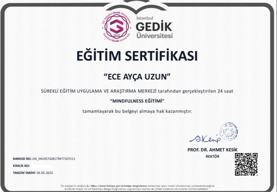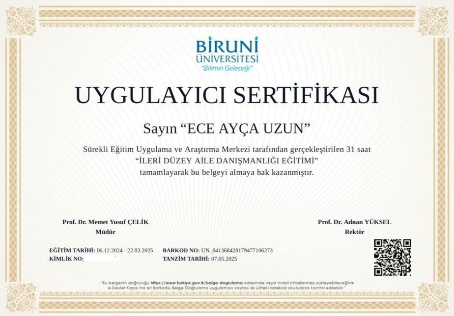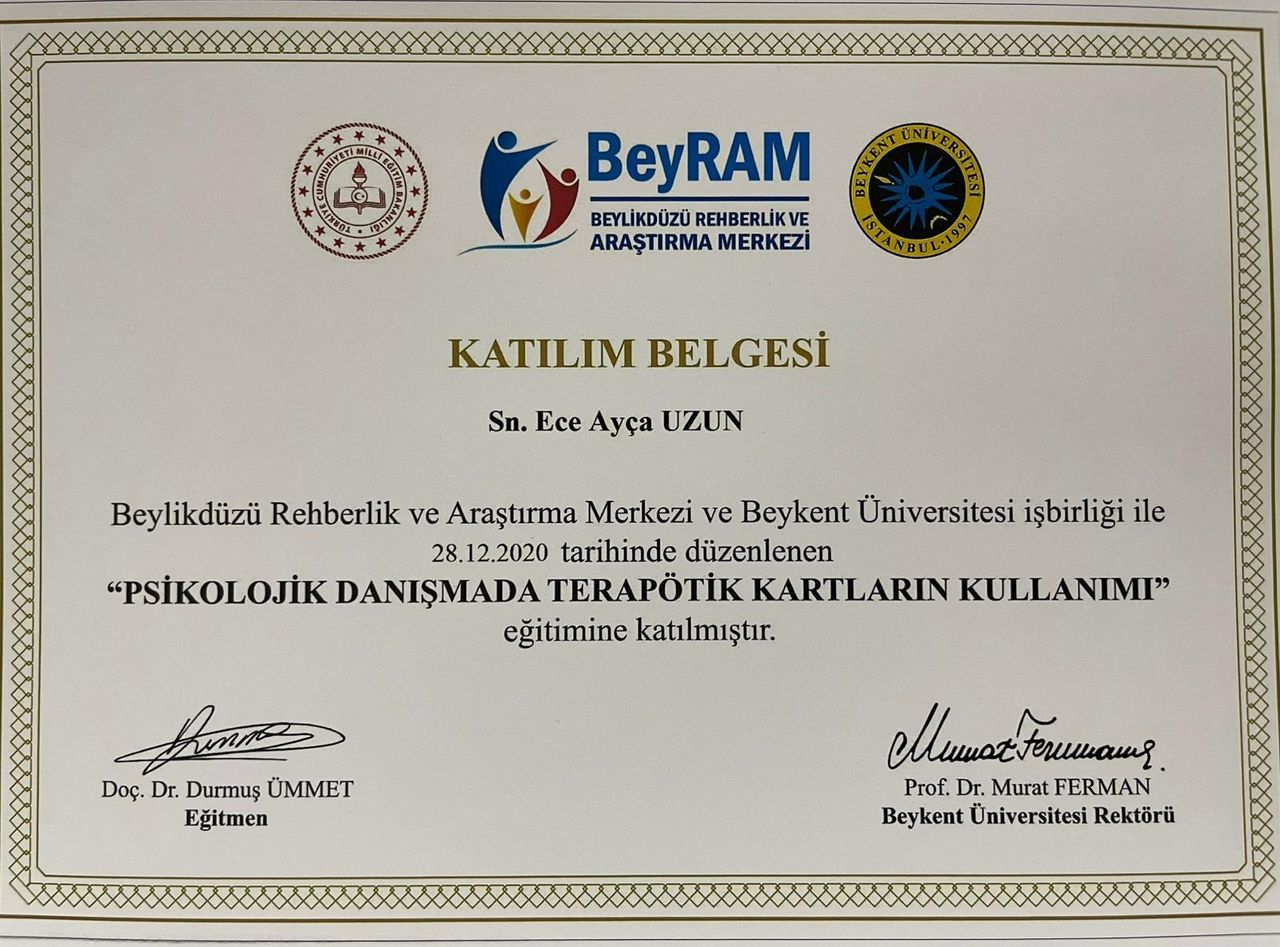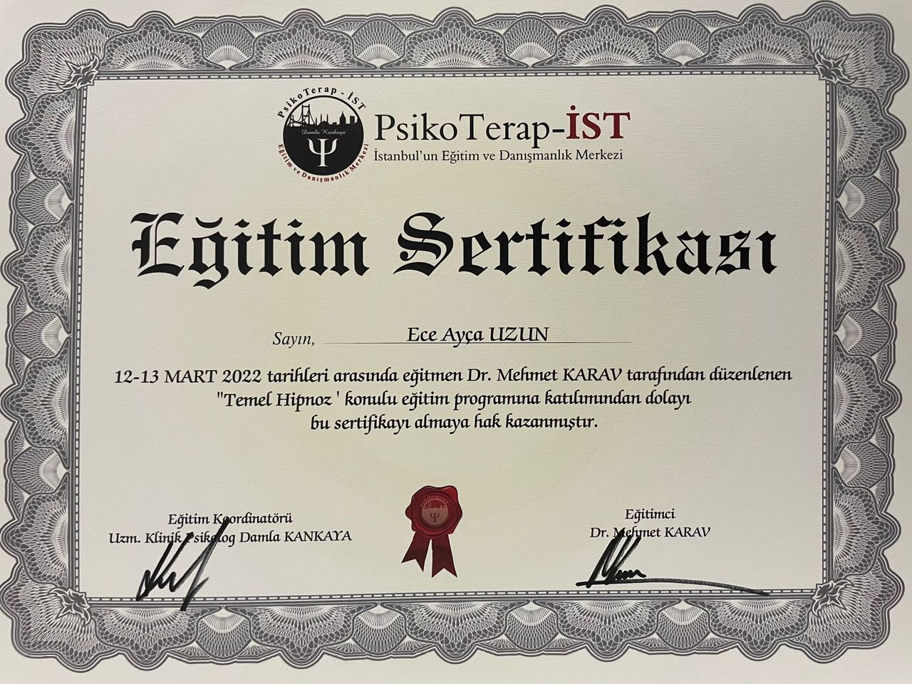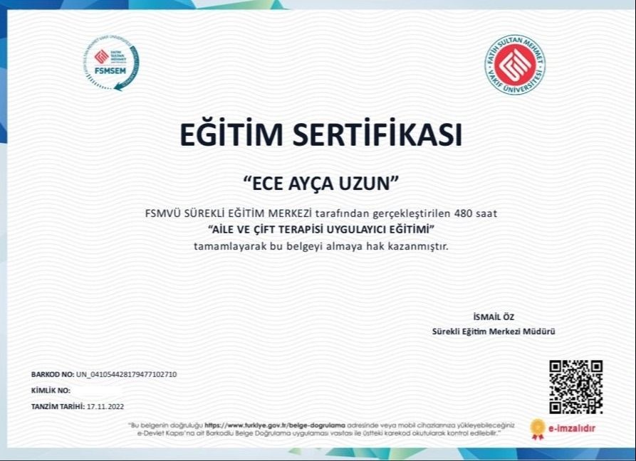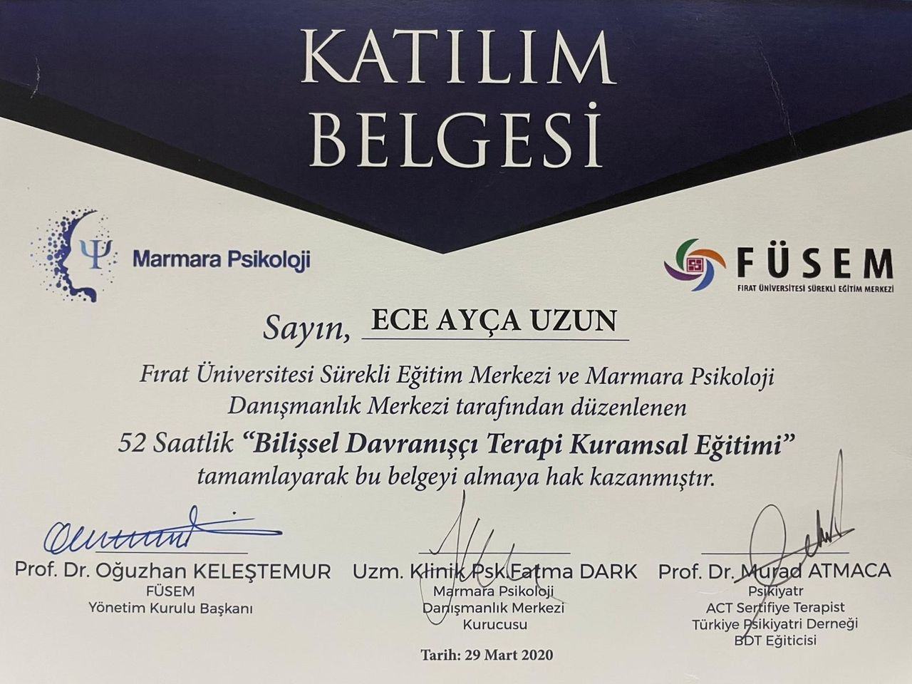 "Psikofarmakoloji" ve "Kilnik Nörobilim" alanlarındaki çalışmalarıyla dünyanın en etkili bilim insanları arasına giren Prof. Dr. Murad ATMACA' dan "Bilişsel Davranışçı Terapi Eğitimi"; Doç. Dr. Onur Okan DEMİRCİ' den "Temel ve İleri Düzey EMDR Eğitimi" almıştır.