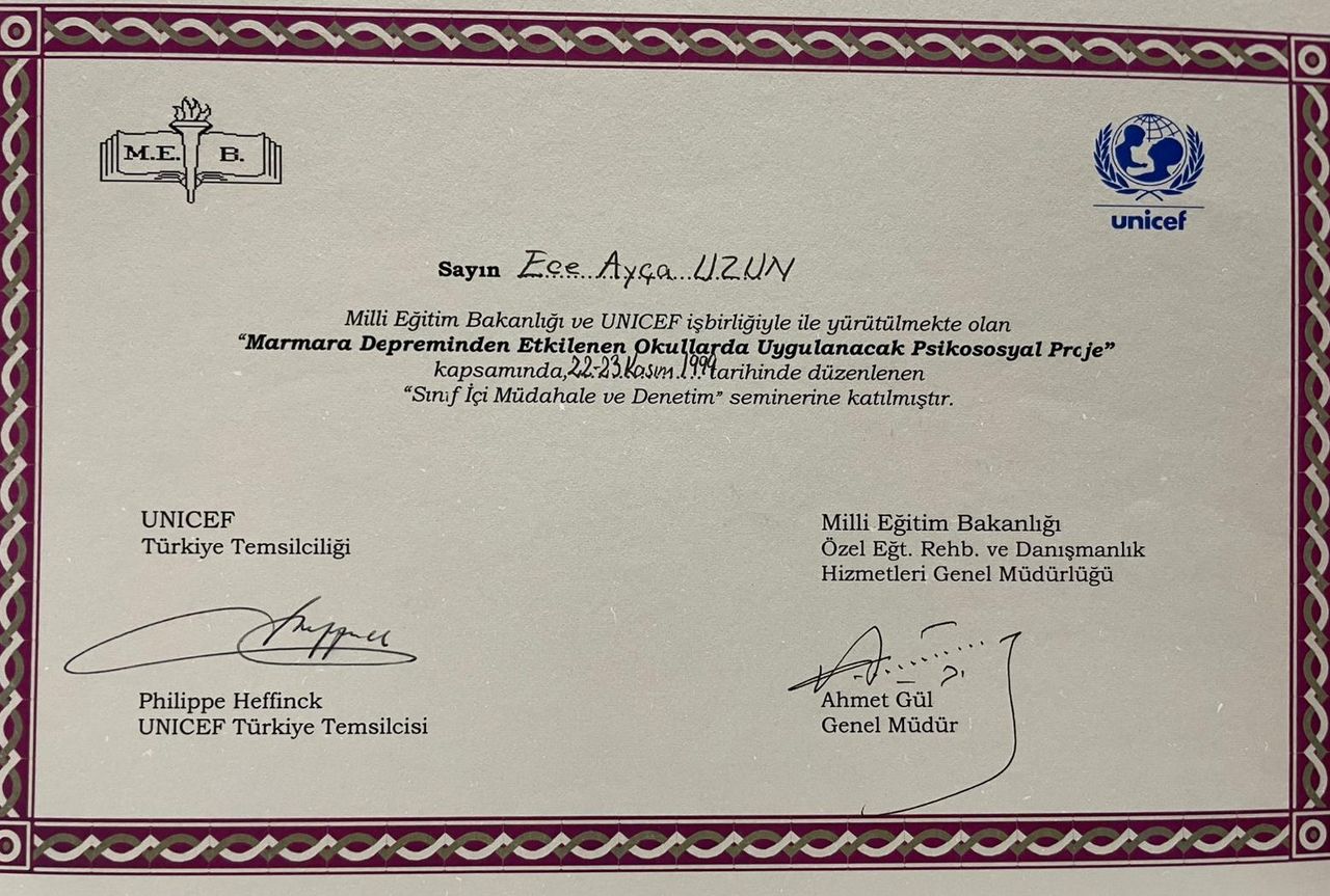 MEB ve UNICEF ortak projesi "7-19 Yaş Aile Eğitimi" eğitmeni olarak ebeveynlere yönelik grup eğitimleri düzenlemiştir.